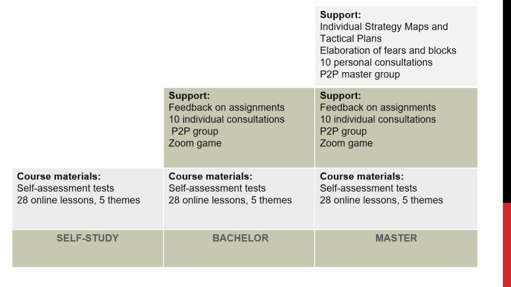 The Master level includes ten additional individual consultations during which you will work through blocks and fears, create your Strategy Maps and Tactical Plan, and defend them in a P2P master group. The condition for admission to the Master level is the completion of all lessons in Theme 1-3 within the Bachelor level.